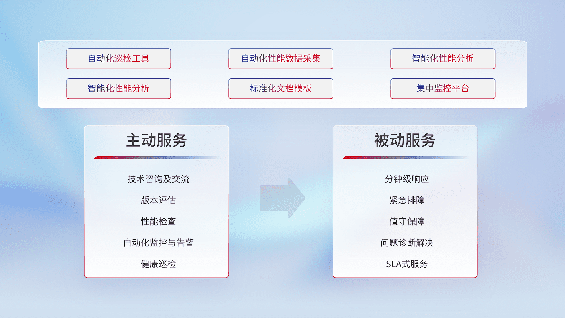 智能化工具和标准化文档,,保障服务质量,,,,提供主动服务(包含技术咨询、、、版本评估、、性能检查、、、、自动化监控与告警、、健康巡检)和被动服务包含(分钟级响应、、紧急排障、、值守保障、、、、问题诊断解决、、、SLA服务)。。。。